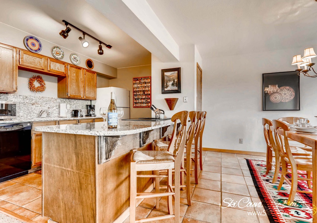 The well-appointed kitchen is fully stocked with all the necessary appliances to meet your culinary needs. From a microwave to a toaster, coffee maker to dishwasher, refrigerator to stove and oven - everything you require is at your fingertips. The kitchen also boasts a new countertop, adding a touch of modernity and functionality to the space. Gather around the rustic wood dining table for six or pull up a stool at the breakfast bar, which seats four, for a quick and convenient meal before embarking on your adventures on the slopes.