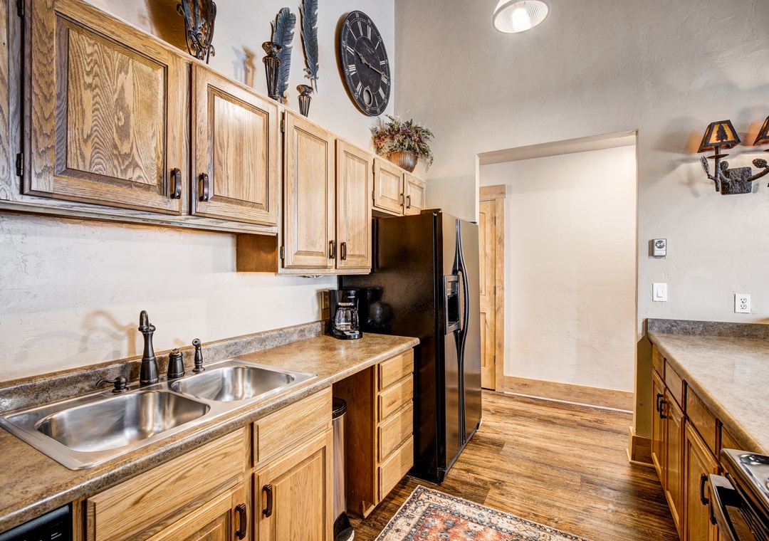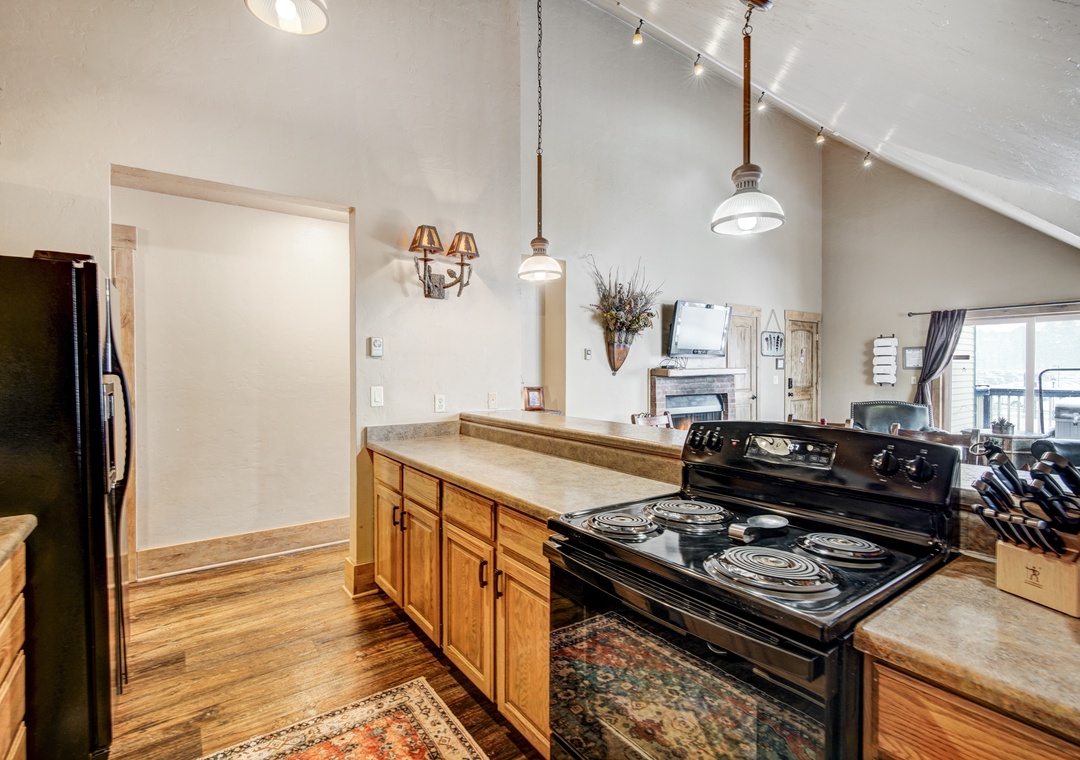 The gourmet kitchen, a culinary haven, boasts all the necessary appliances to unleash your inner chef. From the refrigerator to the drip coffee maker, toaster, stove, and oven - every element is at your disposal. Savor your home-cooked meals in the comfort of the condo at the rustic wood dining table, accommodating up to six guests.