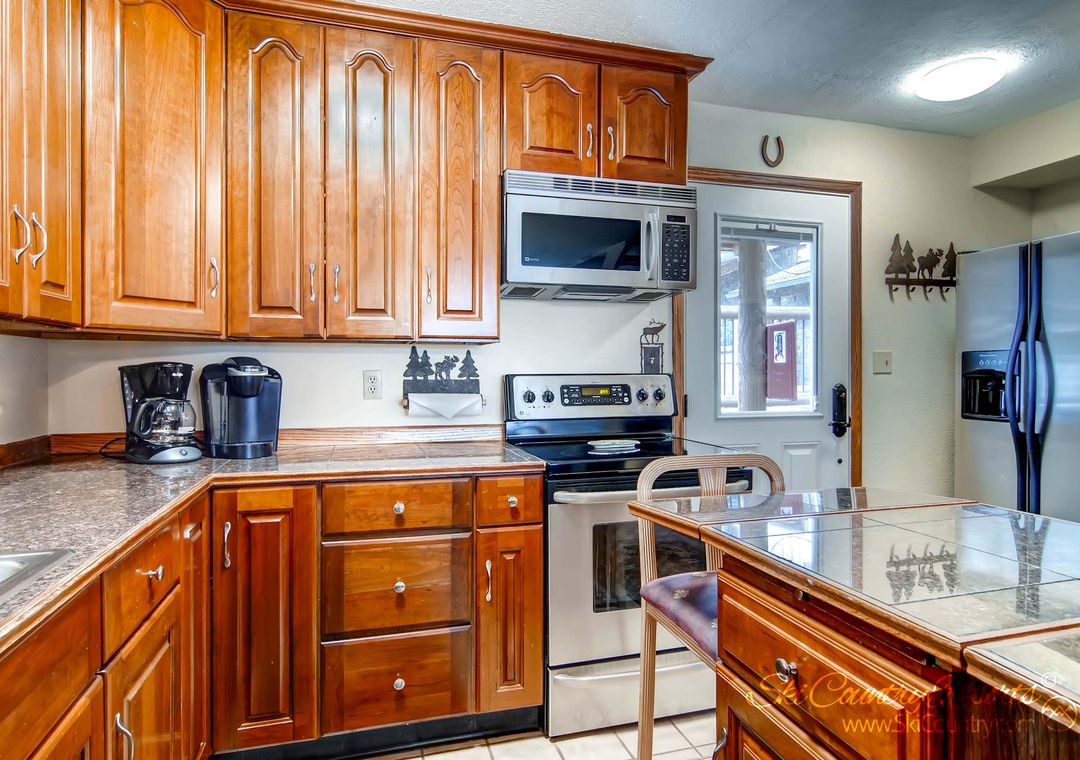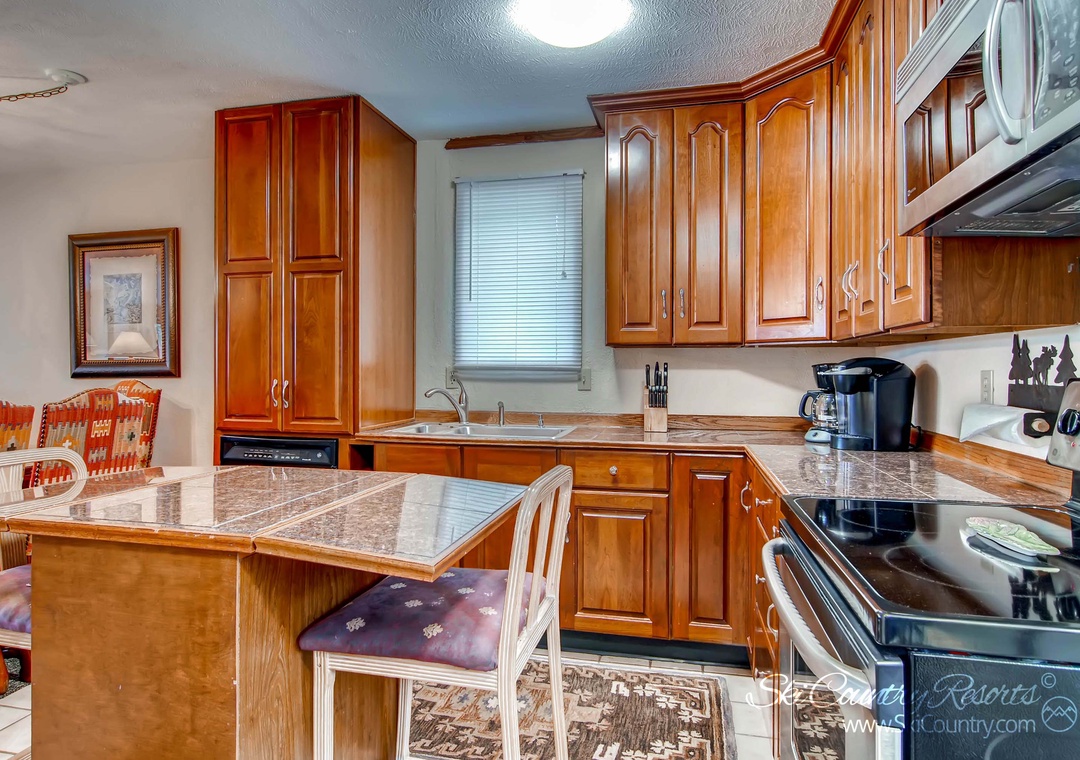 Connected to the living room is a fully stocked kitchen, equipped with all the necessary appliances to satisfy your culinary desires during your vacation. From a stove, oven, and microwave to a refrigerator, coffee maker, and dishwasher, you'll have everything you need to prepare delicious meals. All cooking and dining utensils are also provided. Choose between the large wood dining table for six or the kitchen island with seating for two as you enjoy your freshly cooked meal in the comfort of your own townhome.