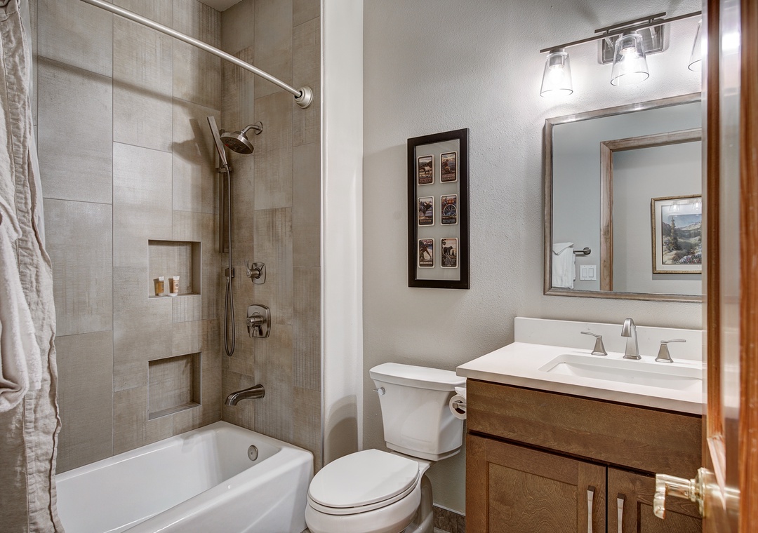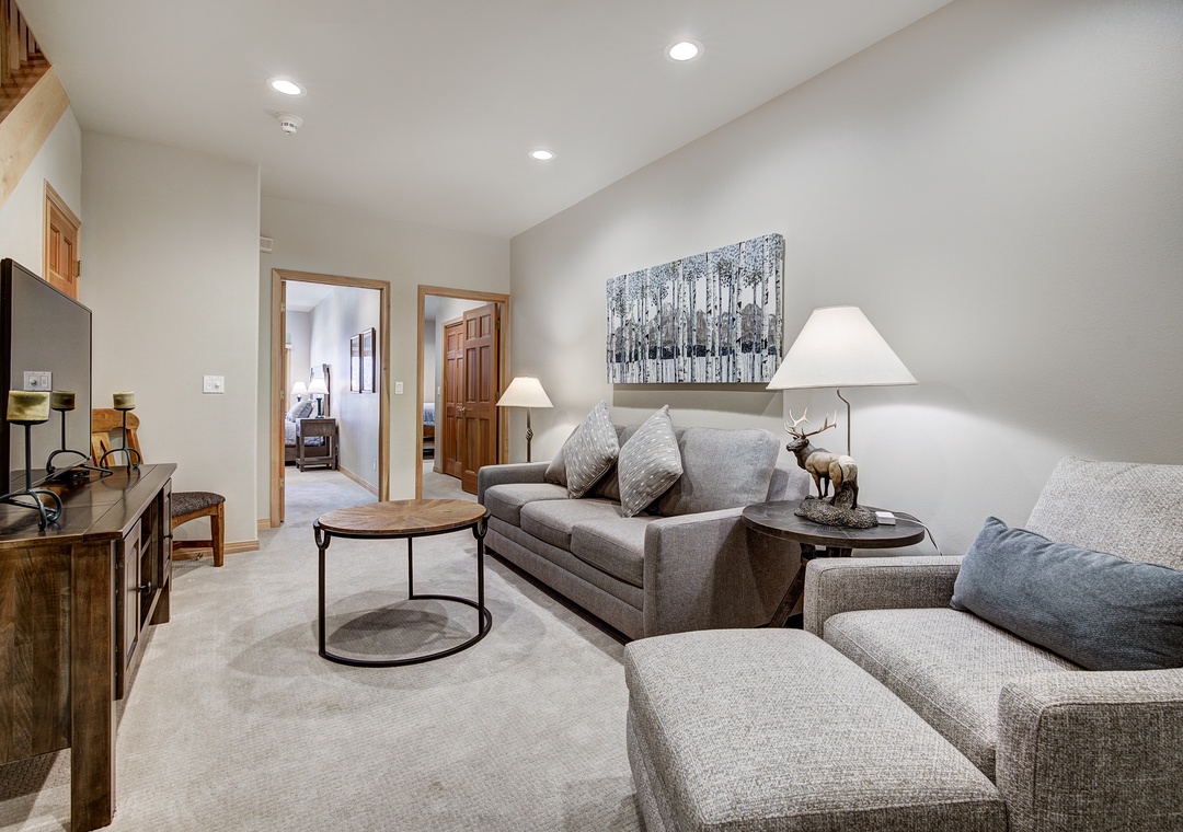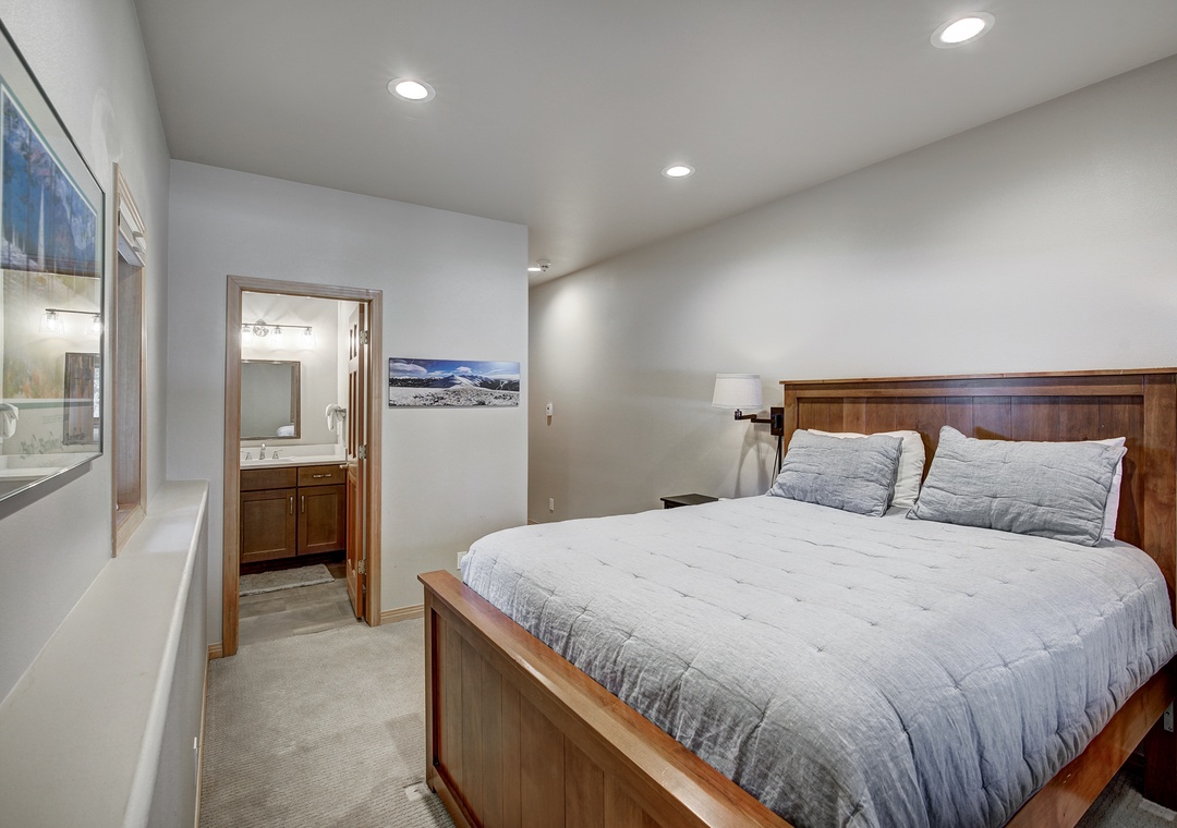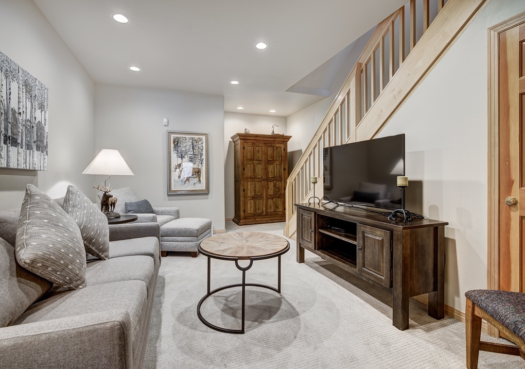 Ascending from the main level, you'll find the master bedroom, a sanctuary of tranquility. Featuring a beautifully encased King bed, a TV with cable, and two cozy side chairs for late-night reading, it offers the perfect respite. The newly remodeled private master bathroom beckons with a luxurious Roman tub, double vanity, and a spacious tiled walk-in shower, all designed to pamper and relax you after an exhilarating day on the slopes. The downstairs den serves as a cozy late-night nook, boasting an entertainment center with a 50-inch flat screen TV and a plush couch, allowing you to enjoy your favorite shows without disturbing others. The second bedroom offers a Queen bed with a private bathroom, while the third bedroom features a new Queen bed with a Trundle, also accompanied by a private bathroom.