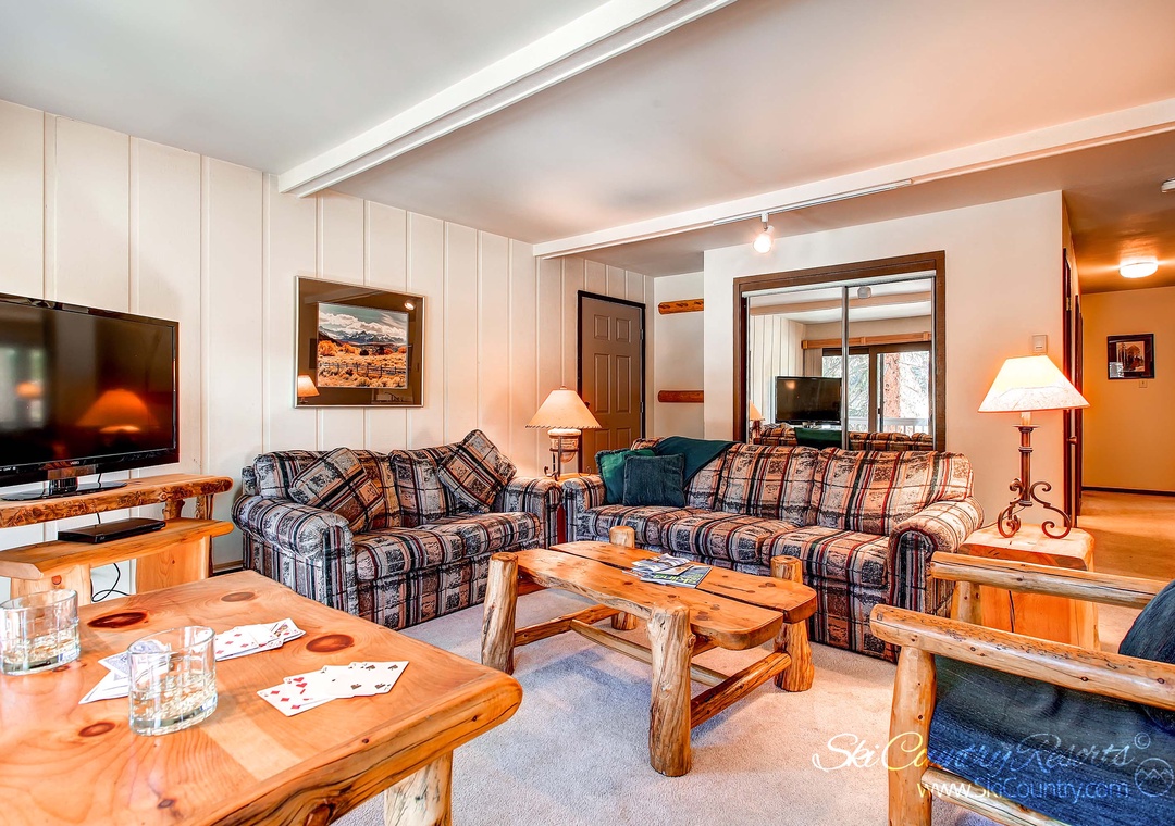 Unwind in the inviting living room area, adorned with a wood-burning fireplace and two cozy couches, ideal for curling up while enjoying a Blu-ray on the 40” flat screen TV. When it's time to rest, this spacious 1,300 square foot unit can comfortably accommodate up to eight guests, ensuring a restful and delightful stay for everyone. Each bedroom offers two Queen Beds, a 32” flat screen TV and mini fridge/coffee maker while a full-sized closet and dresser in each provide ample storage.