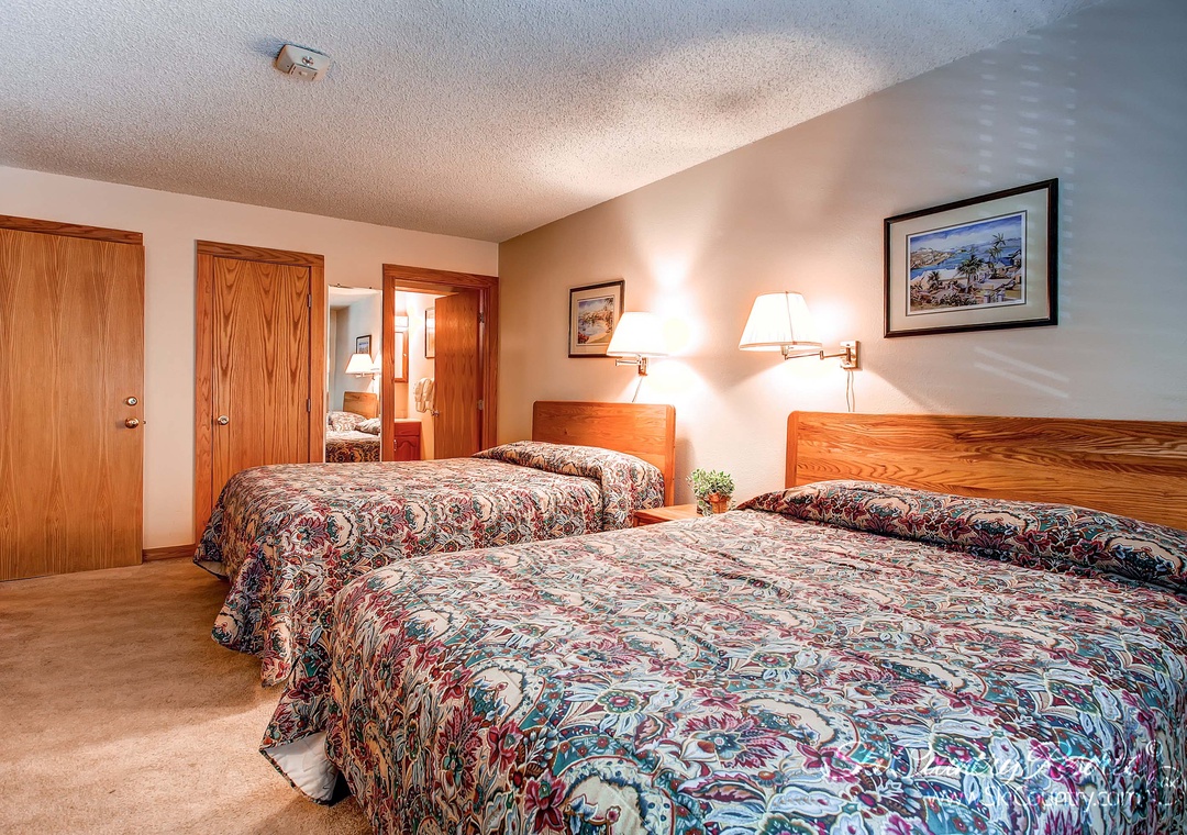 You will enjoy staying in this 228 square foot, hotel style and one bathroom unit. The unit features two Queen beds encased in comfortable, traditional bedding and wood furnishings. The bedroom also features a TV, coffee maker, closet and dresser for storage. The bathroom has cabinets for off-sink storage and a tub shower with sliding glass doors that all ensure a stress free vacation.
