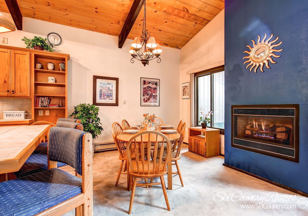 The living room area exudes warmth and comfort, boasting vaulted tongue and groove wood ceilings and cozy gas fireplace. Two couches and a side chair beckon you to sink in and relax while enjoying entertainment on the 35" flat-screen TV.