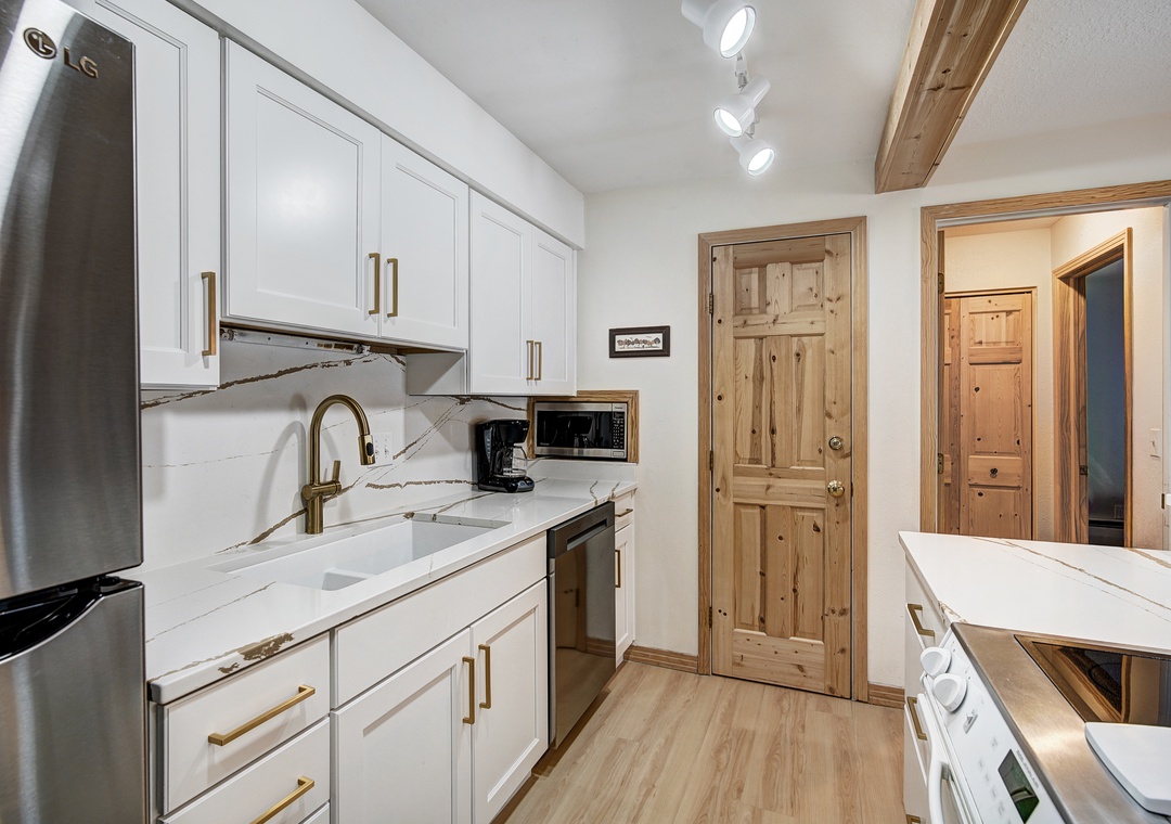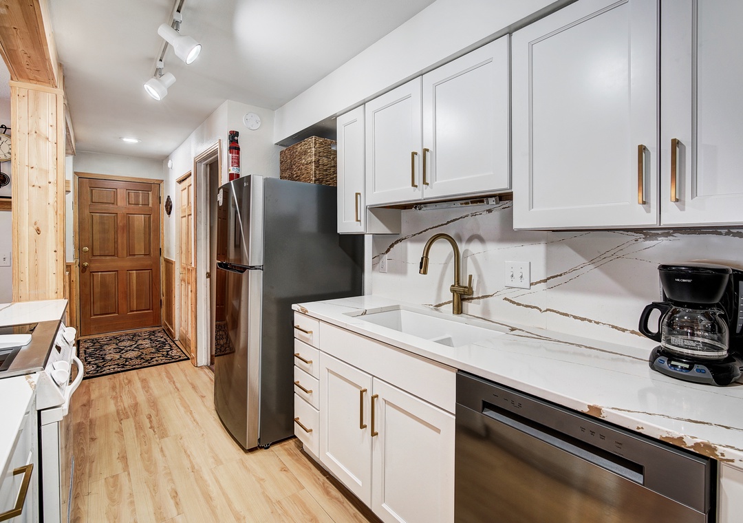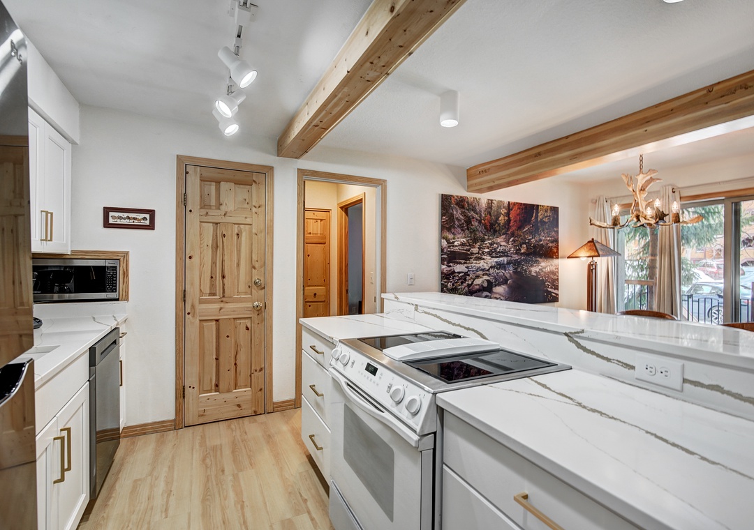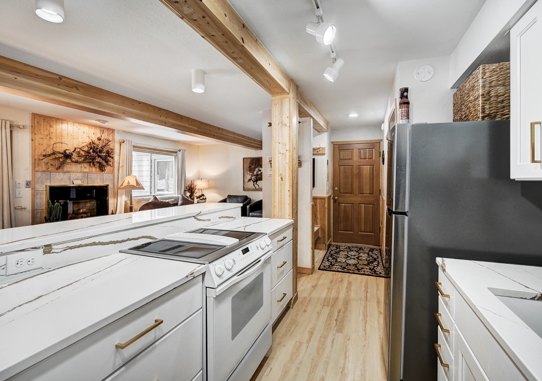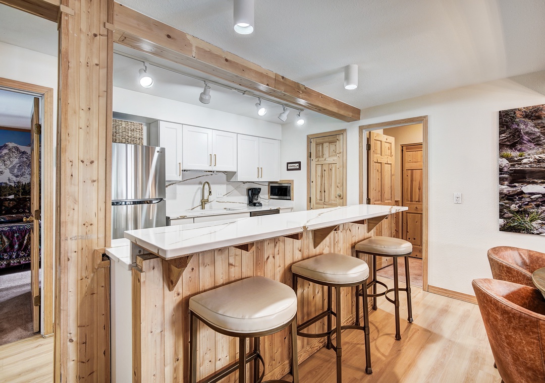 Prepare to be charmed by the delightful mountain town feel that permeates every corner of this cozy retreat. The totally renovated kitchen awaits, equipped with all new stainless steel appliances. Dine at the quartz countertop bar, offering seating for three, or gather around the quaint side dining table, accommodating up to six people. After diner flip the table top for a leather table that's ideal for playing cards and board games.