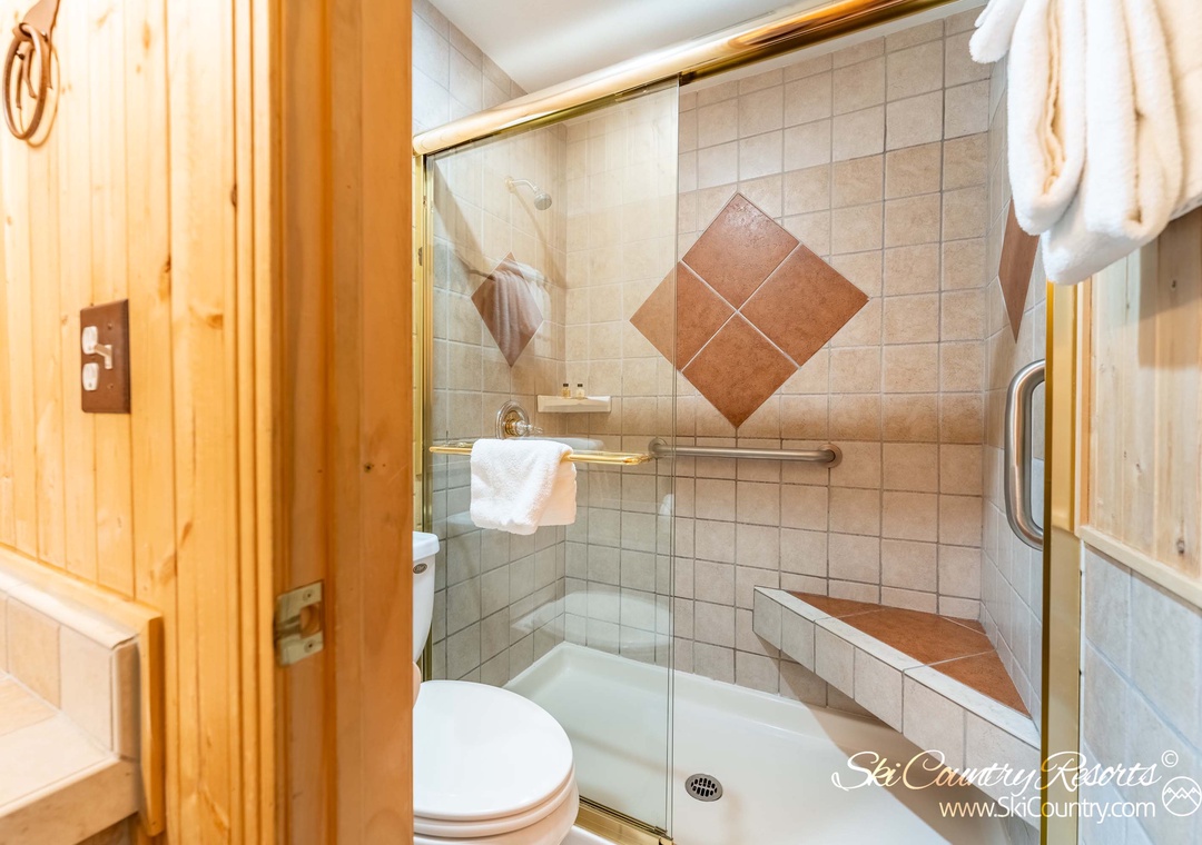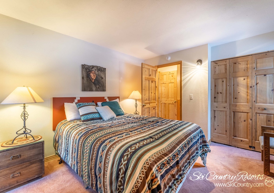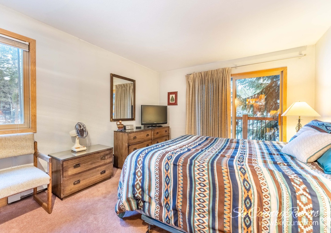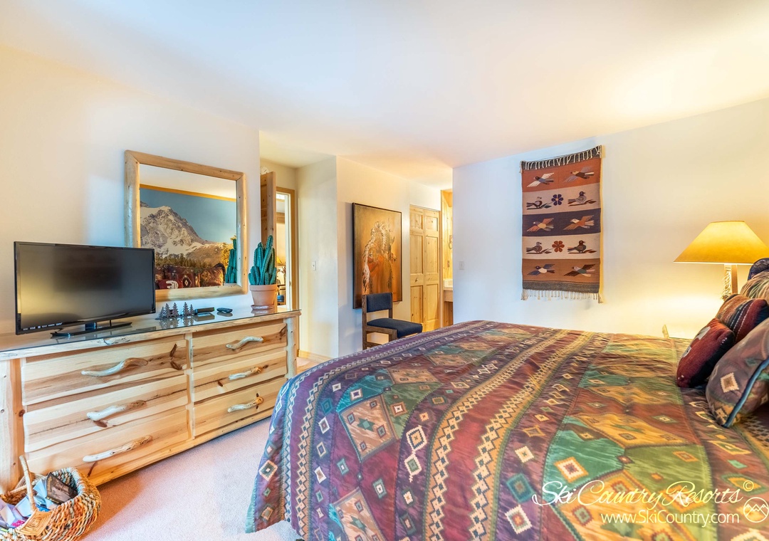 Retire to the master bedroom, adorned with tasteful mountainous decor. Here, a comfortable King bed, adorned with soft bedding, awaits you, accompanied by a flat screen TV for your entertainment. The second bedroom features a Queen bed, also dressed in cozy bedding, and a TV to enhance your relaxation. With the addition of a Queen sofa sleeper, this unit comfortably accommodates up to six people. After an exhilarating day spent exploring the great outdoors, pamper yourself with a rejuvenating hot shower or indulge in a soothing bath.