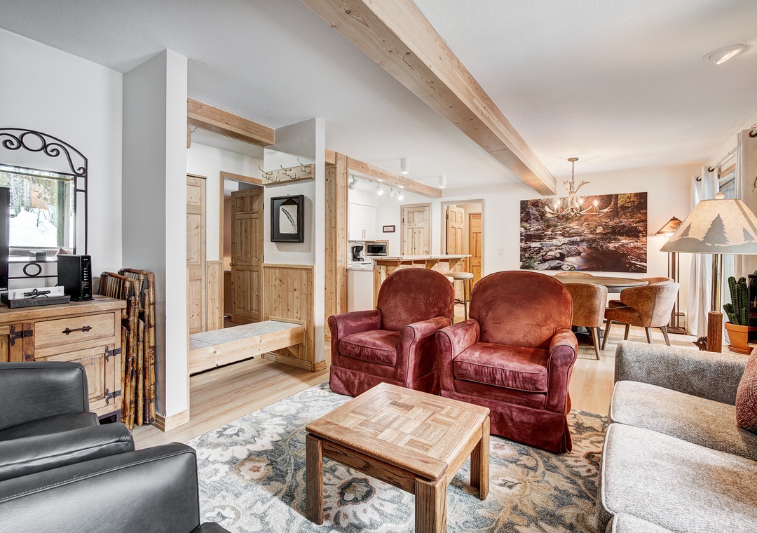 Great location just south of the base of peak 9. Easy access to all of break and the free shuttle makes getting around simple. The 2nd bedroom has a jetted tub which is nice after a long day on the slopes. Only down side is the furniture is very uncomfortable. The couch (that seats 3) is fine but the chairs are awkward & uncomfortable and makes lounging more difficult. Beds are also not the most comfortable.- Reviewed On: 1/22/2018