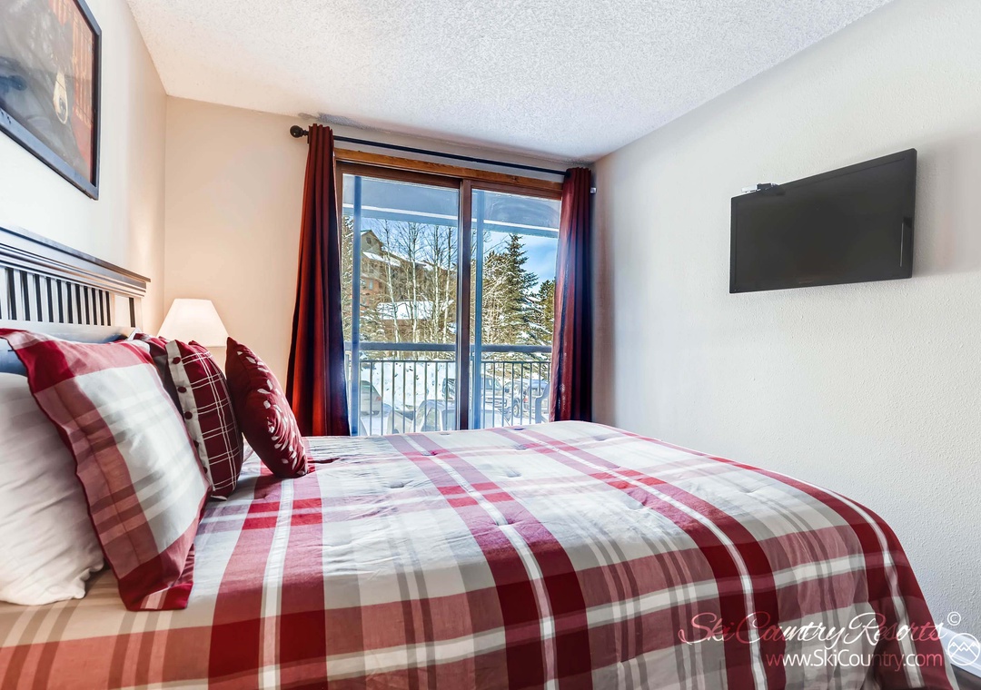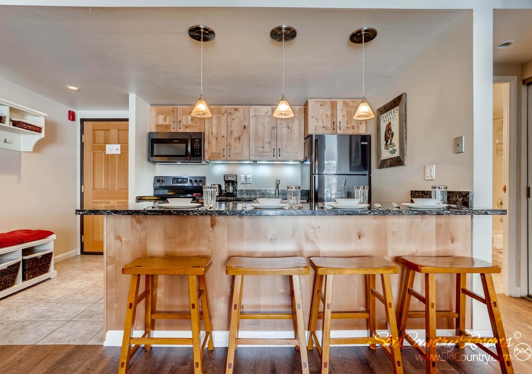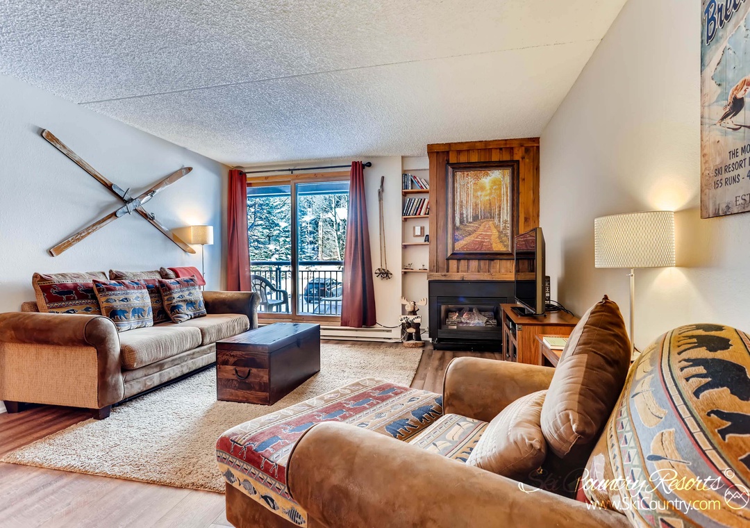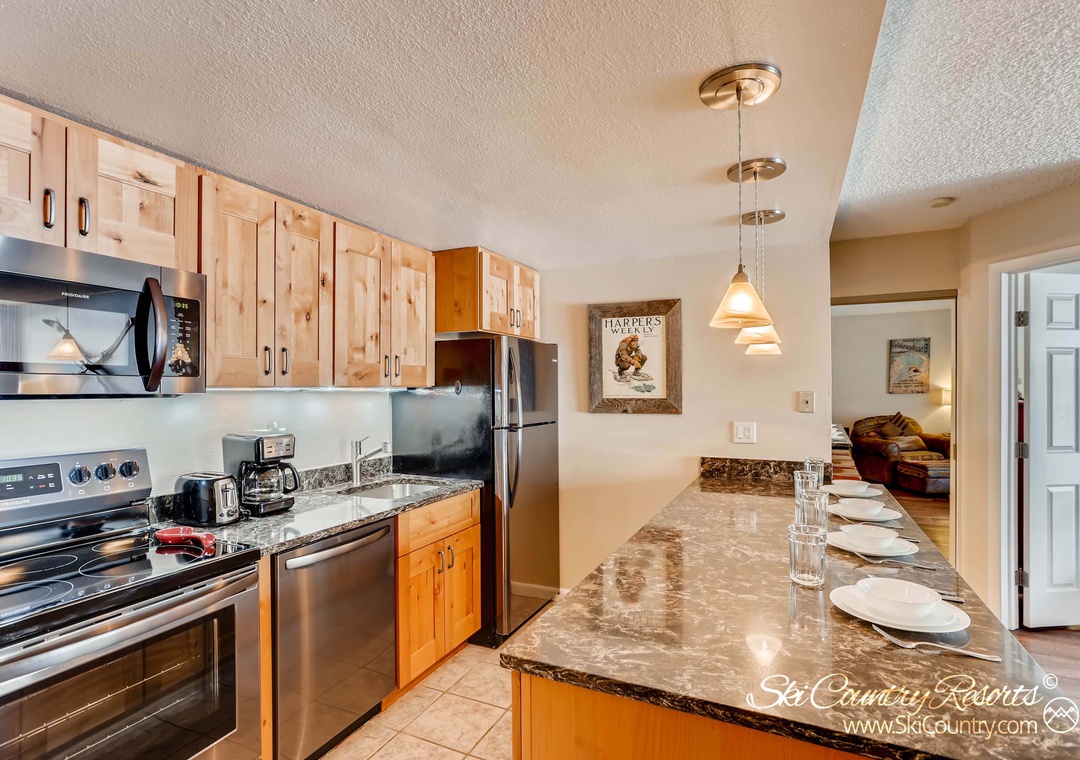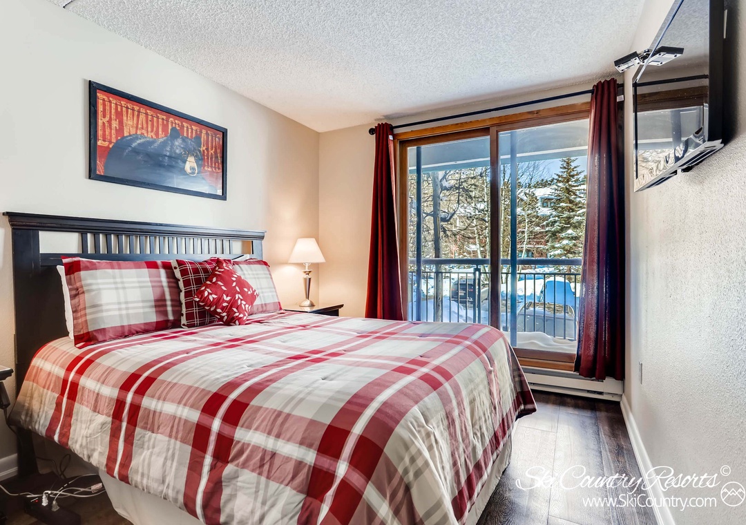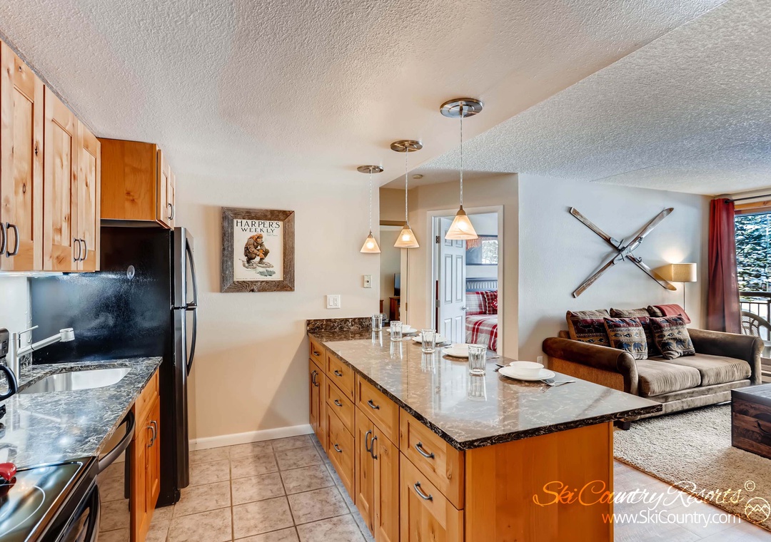 After a day on the slopes, unwind in the living room, where relaxation takes center stage. Watch a DVD movie or stream your favorite Netflix series (by logging in to your Netflix account) on the 42" LED Smart TV, or simply cozy up by the gas fireplace in the oversized armchair with a good book and a cup of hot cocoa. On sunny days, step out onto the private balcony and take in the breathtaking mountain views.