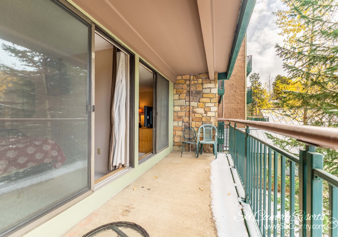 In the living room, bask in the warm glow of the stone-fitted gas fireplace and the abundance of natural light streaming in through the large patio door windows, casting a golden ambiance that beautifully complements the cozy alpine atmosphere. Explore a plethora of TV channels on the impressive 46-inch flat-screen TV or sink into the sumptuous suede couch or oversized armchair for a quiet evening read. Brew a fresh cup of coffee or steep some tea with the provided coffee maker and tea kettle, then take your beverage of choice outside to the spacious private balcony.