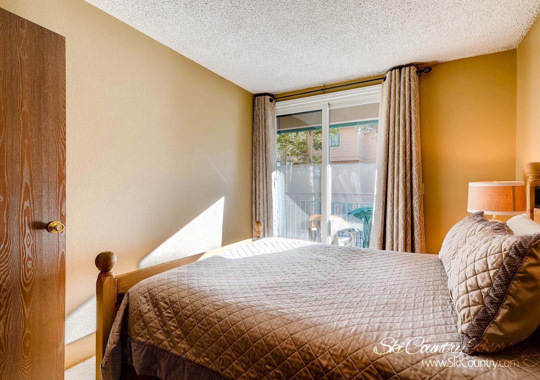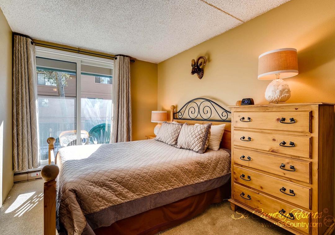 The bedroom is a tranquil retreat featuring a comfortable Queen bed adorned with sumptuous bedding. Sliding glass doors offer another entrance out to your unit's private deck, allowing you to wake up to the crisp mountain air and soak in the natural beauty. With the additional Queen sofa sleeper in the living room, this unit can comfortably accommodate up to four people, making it an ideal choice for couples or a small family. After a day of outdoor adventures, pamper yourself with a rejuvenating hot shower or a soothing bath in the well-appointed bathroom.