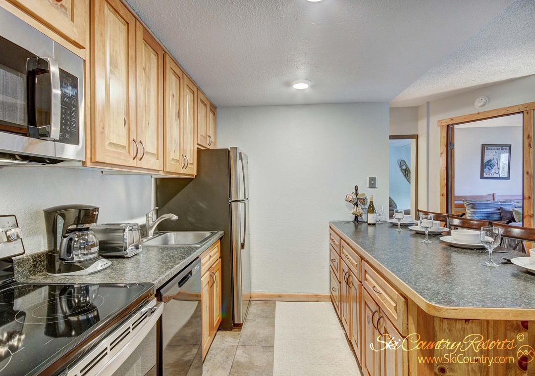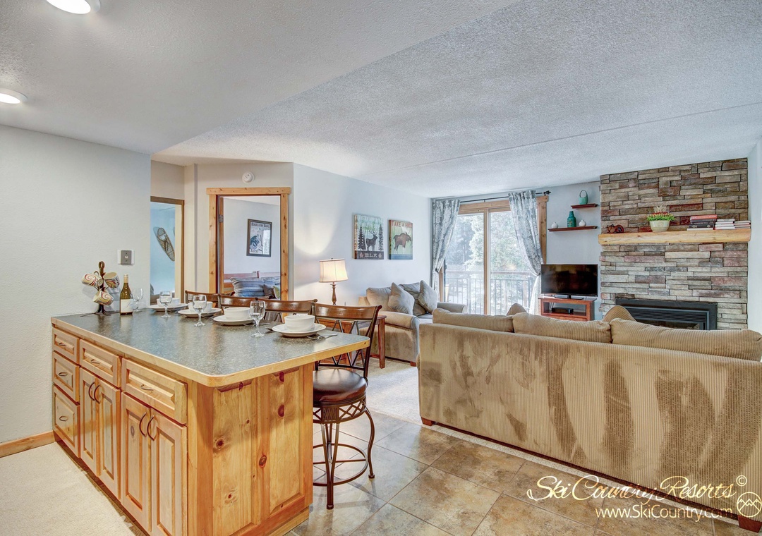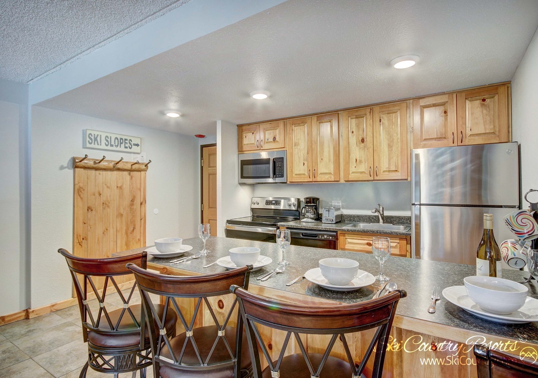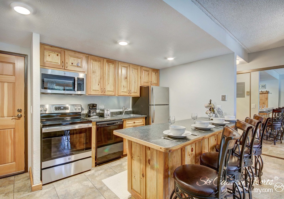 Upon entering, you'll be greeted by a warm and inviting space that spans 560 square feet. The suitably stocked kitchen is a chef's dream, fully equipped with all the glassware, dishware, and cooking utensils you could possibly need to whip up and serve your favorite home-cooked meals. Whether you're preparing a hearty breakfast before hitting the slopes or a romantic dinner for two, this kitchen has you covered. There's even a countertop bar where you can savor your culinary creations in the comfort of your own unit.