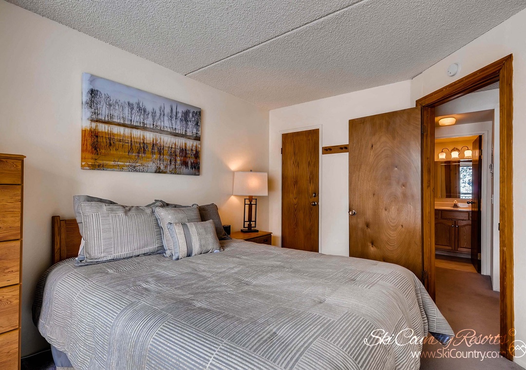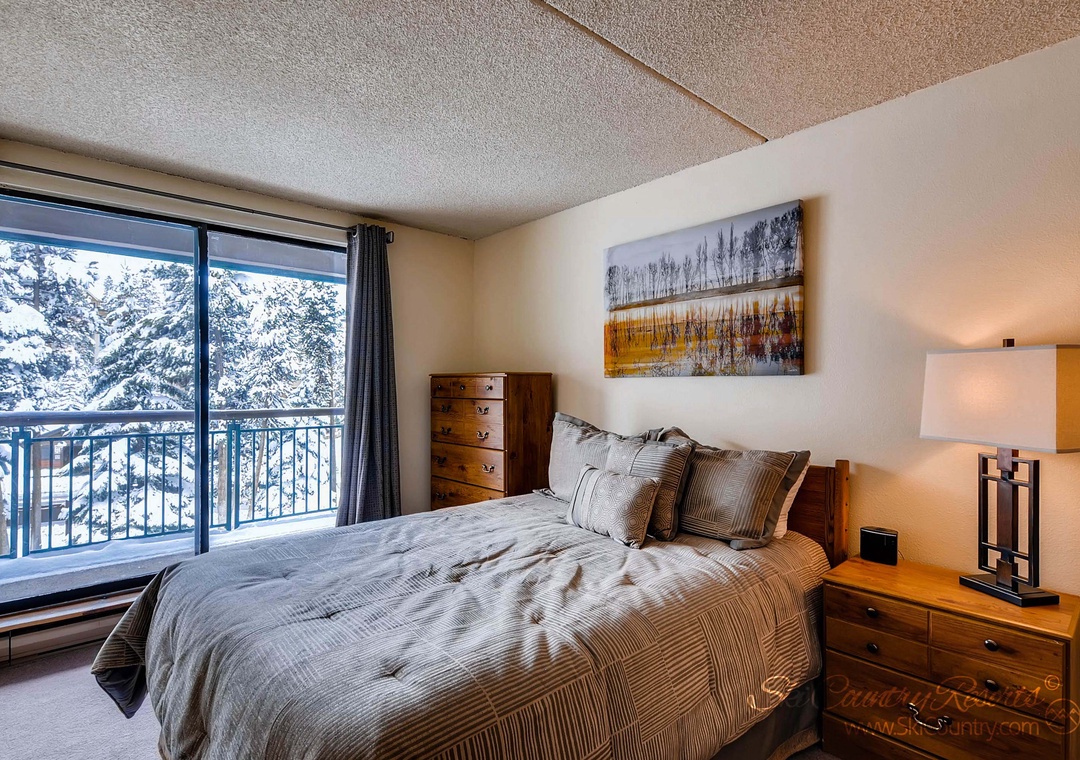 The bedroom is outfitted with Queen bed along with two dressers that provide ample storage for your belongings, ensuring a clutter-free environment. Plus, with direct access to the unit's private deck, you can wake up to the sight of nature's beauty just outside your window. If you're traveling with family or friends, the Queen sofa sleeper in the living room offers additional sleeping space, accommodating up to four guests in total.