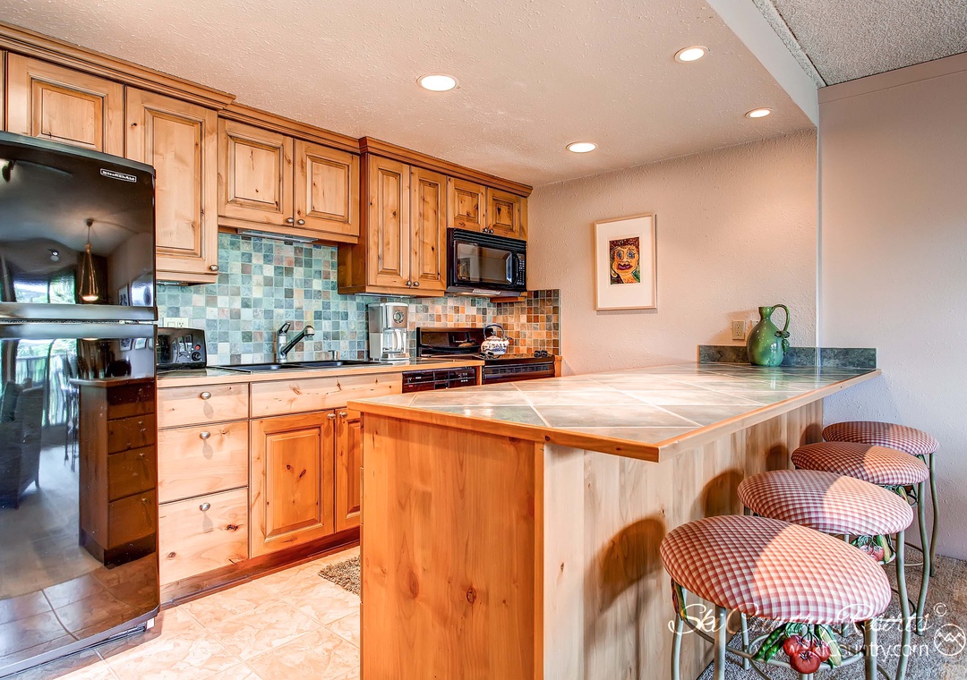 As you step inside, you'll be greeted by the warmth of ski-town ambiance. The stylishly adorned kitchen is a chef's dream, fully equipped with glassware, dishware and cooking utensils for crafting your favorite home-cooked meals. You'll have all the necessary appliances, including a microwave, stove, oven, dishwasher, refrigerator, and coffee maker, to make your meal making effortless. Savor your culinary creations at the countertop bar with seating for four, or gather around the exquisite wood dining table that comfortably accommodates six.