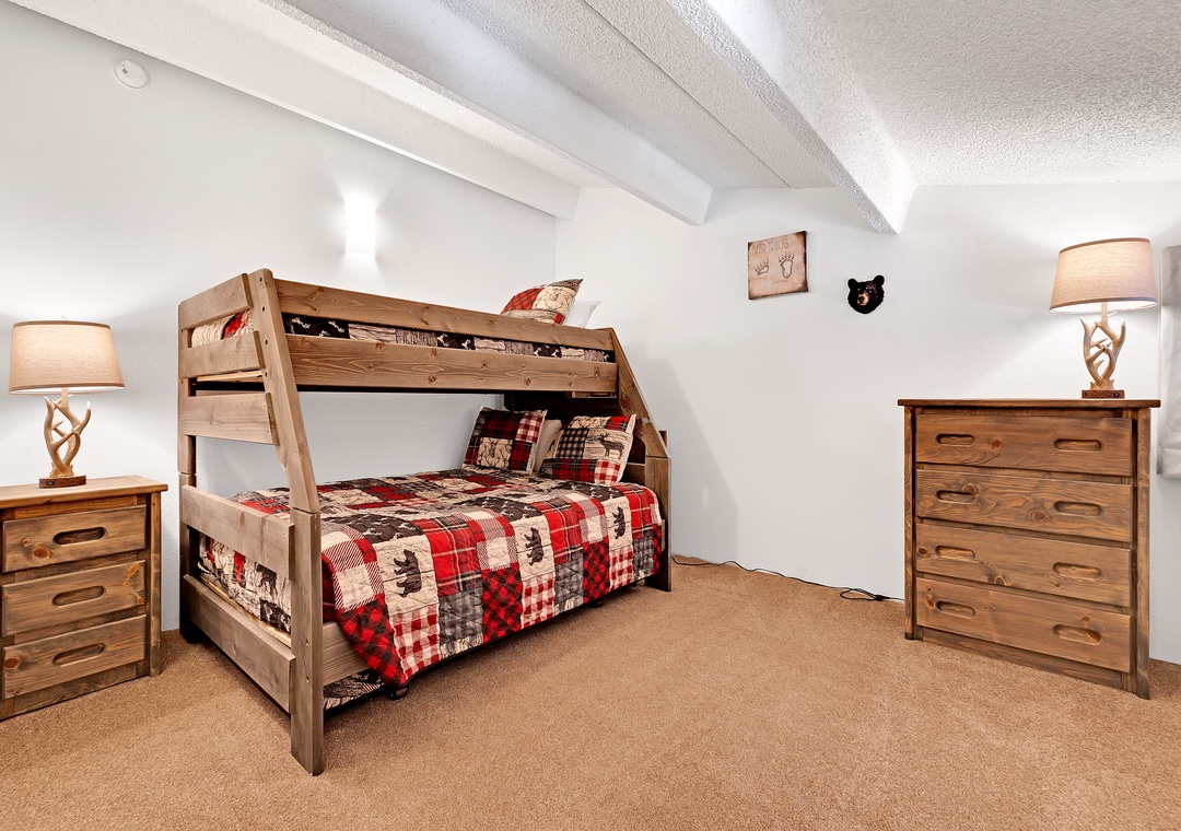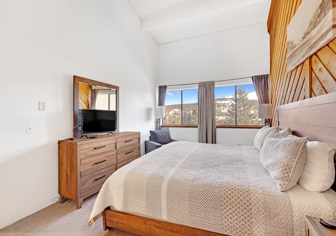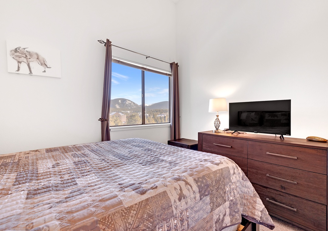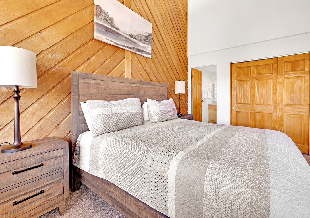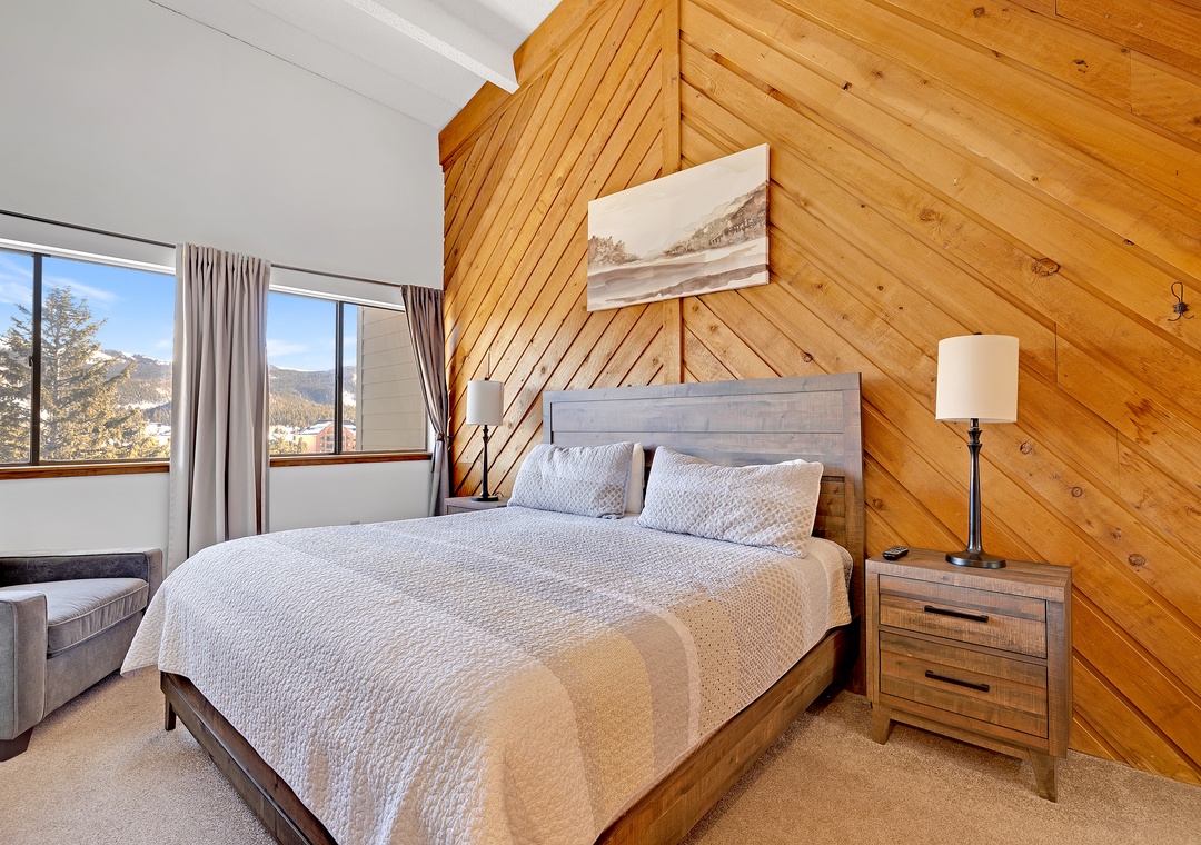 Retreat to the master bedroom, a haven of repose where a King bed awaits accentuated by elegant wood furnishings. Next, the second bedroom offers a cozy Queen bed dressed in snug bedding. Above, the open loft area features yet another Queen bed and a cozy eyrie adorned with mountain-inspired décor.