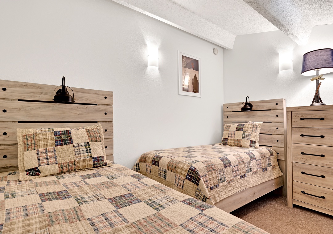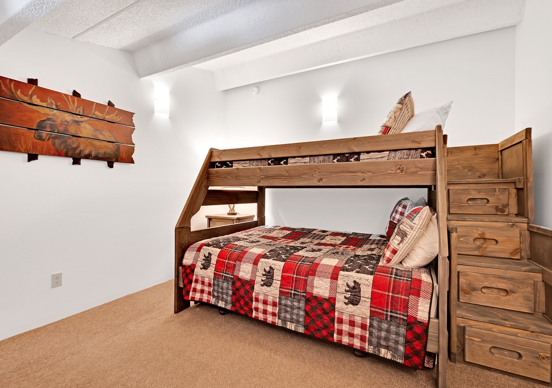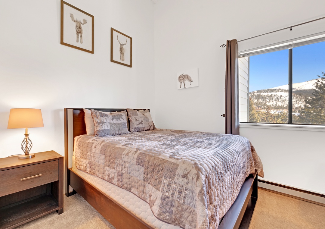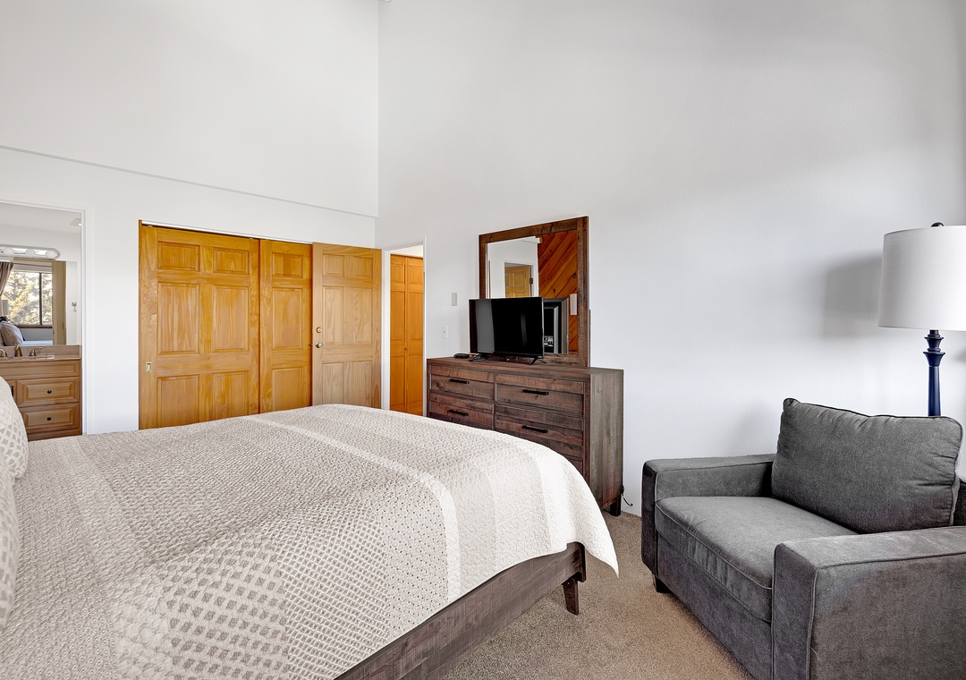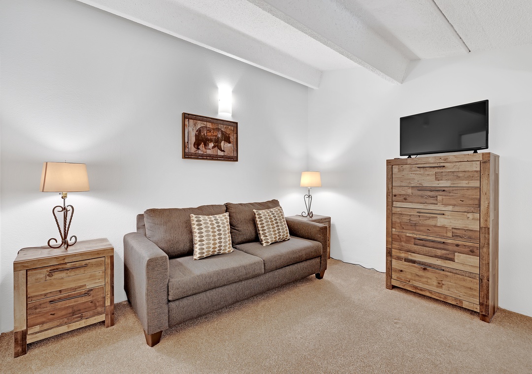 Retreat to the master bedroom, a haven of repose where a King bed awaits accentuated by elegant wood furnishings. Next, the second bedroom offers a cozy Queen bed dressed in snug bedding. Above, the open loft area features yet another Queen bed and a cozy eyrie adorned with mountain-inspired décor.