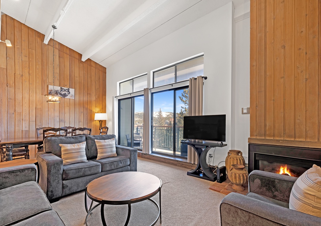 In the nearby living room, adorned with plush couches and side chairs, you'll find a sanctuary for relaxation. Lose yourself in a cinematic journey on the DVD-equipped TV or delve into the pages of a vacation read, all while the gas fireplace casts a golden glow and soothing warmth that envelops the room.