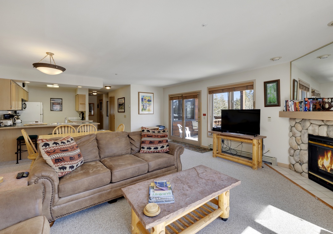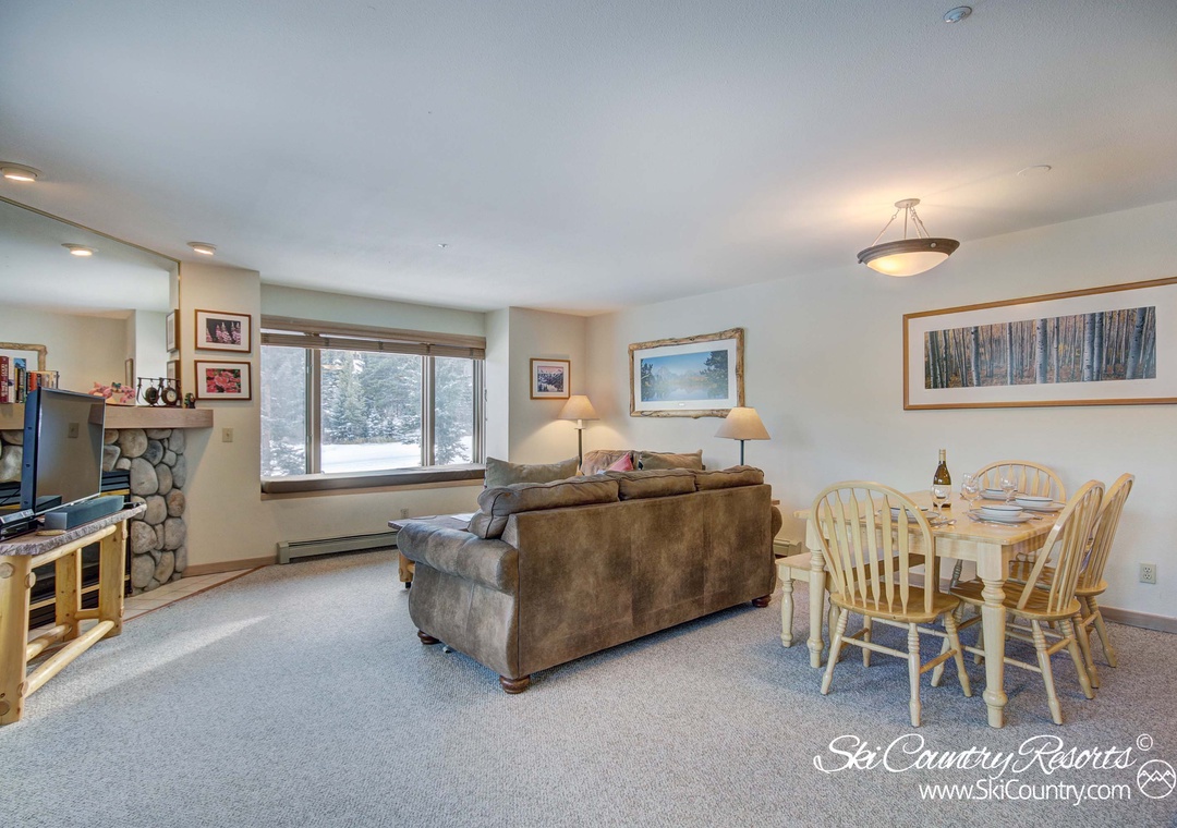 Inside the condo, a warm and welcoming ambiance awaits. Perfectly suited for families, this spacious open living area seamlessly combines entertainment, cooking and dining spaces. Sink into the plush comfort of the couches and the additional bay window seating as you catch your favorite movie on the flat-screen TV. The fully equipped kitchen beckons culinary enthusiasts to whip up delicious meals, and the gas fireplace adds a cozy touch to your dining experience. The dining table seats four comfortably, with room for three more at the breakfast bar.