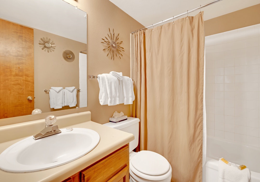 The comfortable master bedroom features a cozy queen bed adorned with plush bedding, a 32" flat-screen TV for your entertainment, and ample storage space with two dressers. Indulge in the convenience of a private bathroom boasting a convenient shower/tub combination. The second bedroom offers a full-size bunk bed, side chair, and two dressers for all your storage needs. An additional shared bathroom, also equipped with a shower/tub combo, ensures that everyone has their own space to refresh and rejuvenate. With the queen sofa sleeper in the living area, this condo can comfortably accommodate up to eight guests.