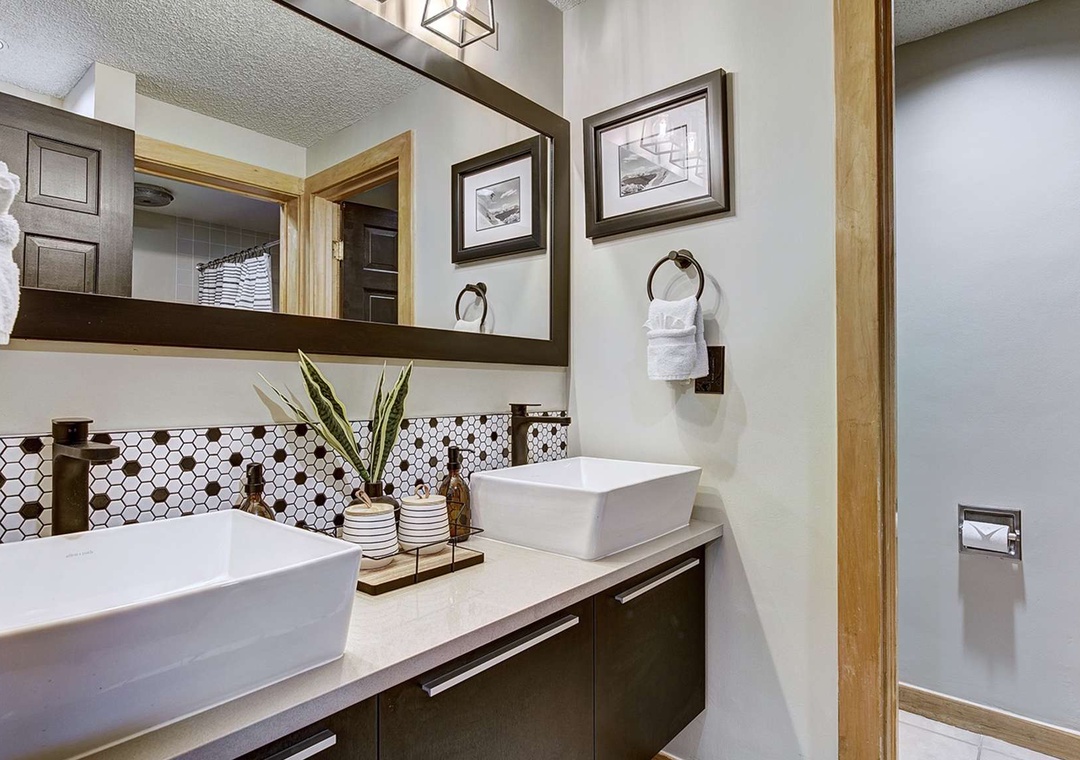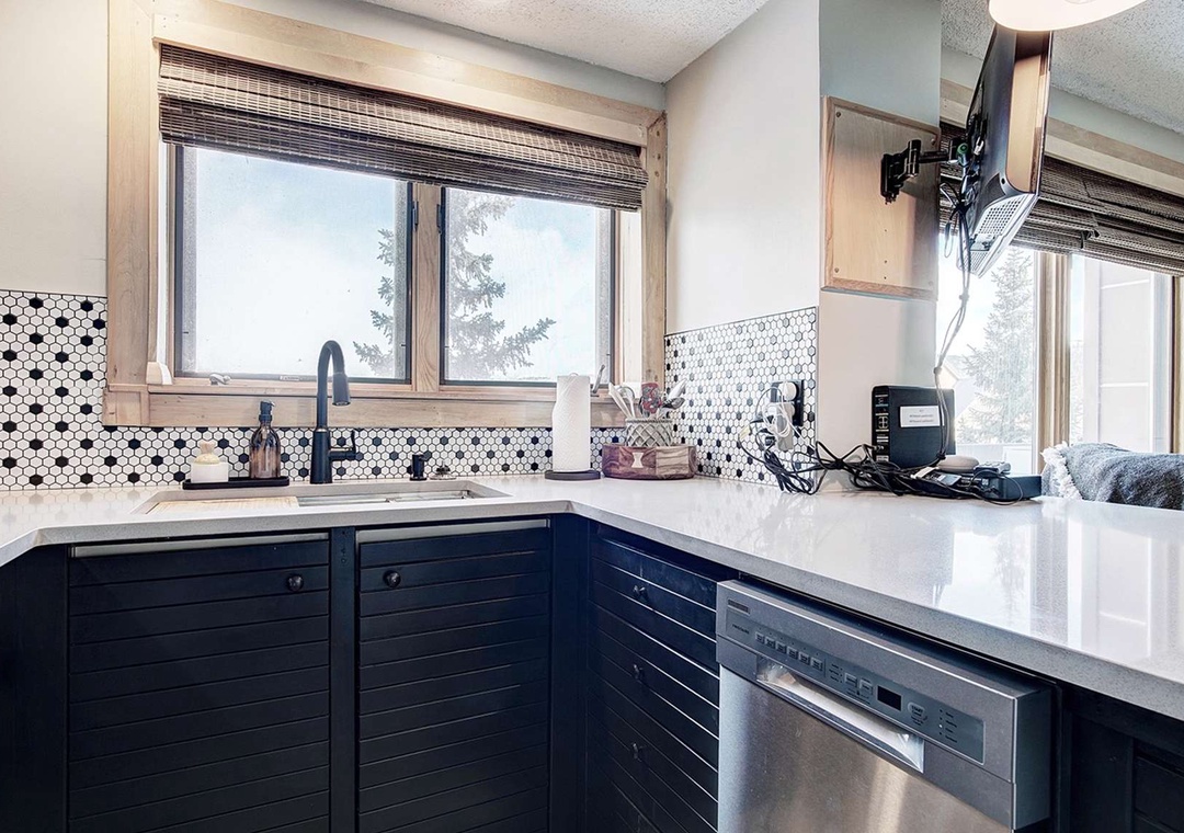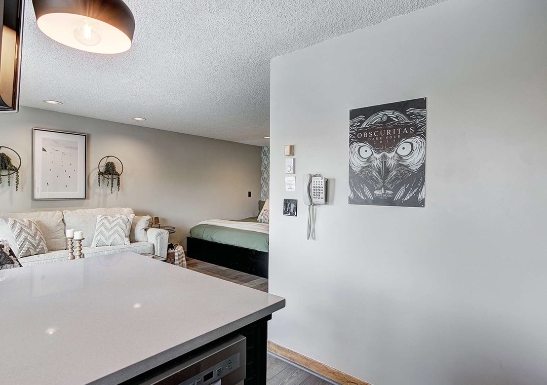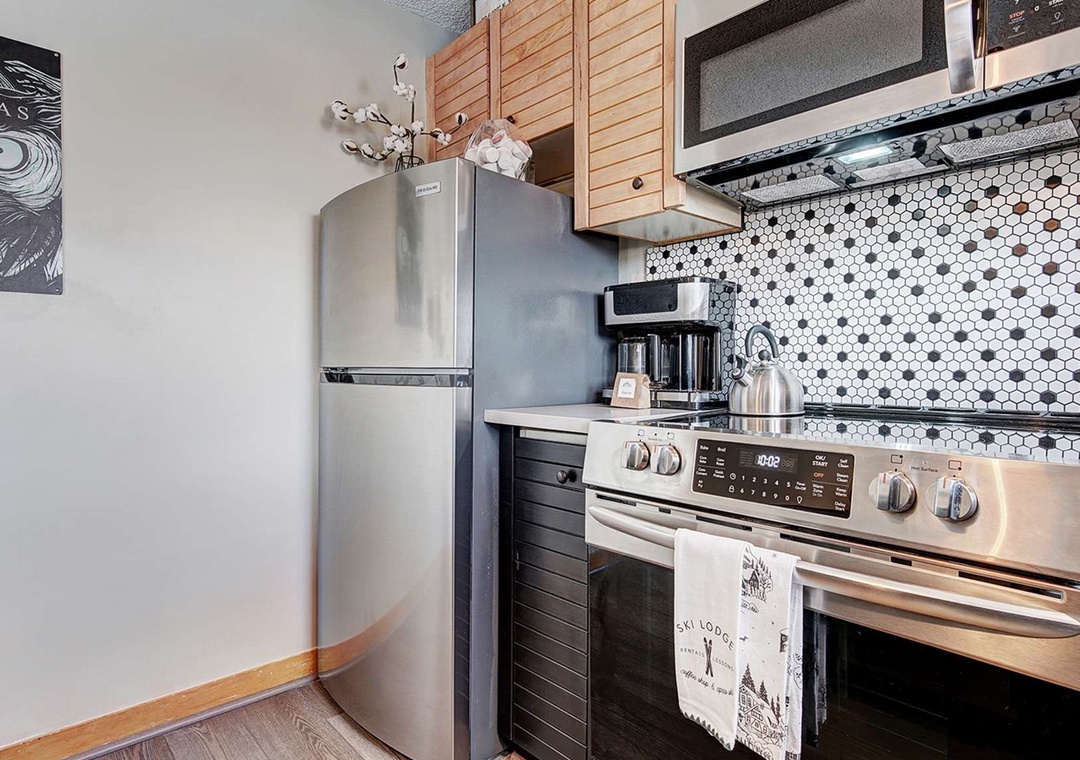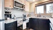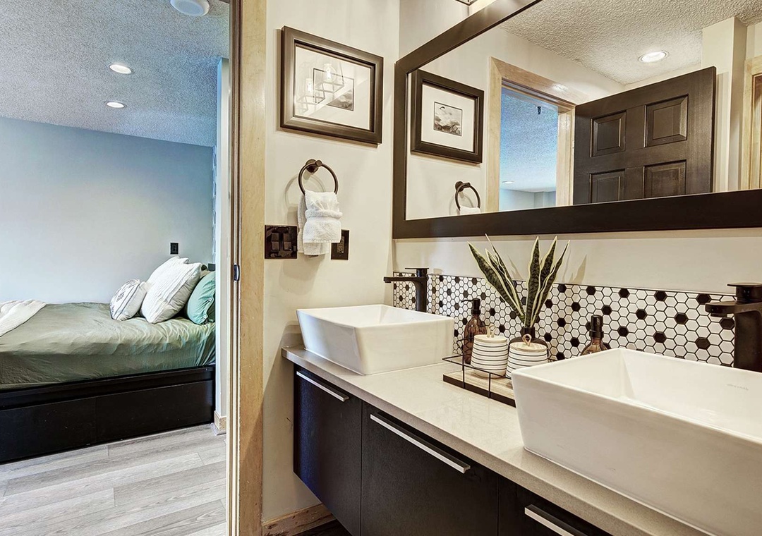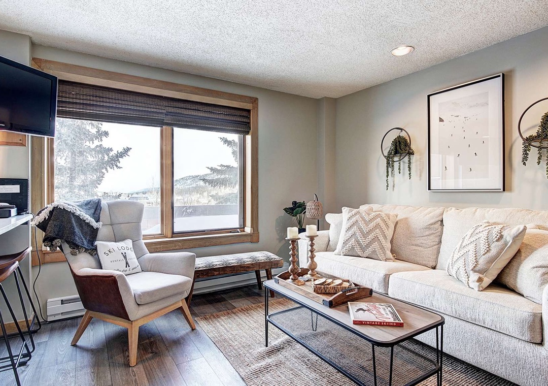 New renovations bring a modern, yet classic style to this condo, including a spacious King Size bed, new appliances, and a fun vintage ski vibe. Guests have plenty of room to relax on all new furniture in the living area in front of a flat screen TV, with full Google Home integration so you can cast your favorite videos and play your favorite music from your phone / smart device! The views from the living area are impossible to beat! Look outside to see the slopes on Peak 9, catch a glimpse of the Quicksilver Chairlift, and people watch from the privacy of the unit. The full, updated kitchen provides a perfect wet bar area and is equipped with all major cooking appliances and utensils, including a combo Keurig / coffee maker. The large bathroom is comprised of three separate rooms, including a dual vanity, for your convenience and privacy.