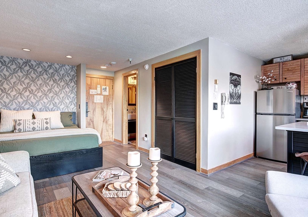 This spacious studio suite sleeps 4 and is perfect for year-round adventures. In the winter, you can enjoy skiing, easy ski school access on Peak 9, snowboarding, dog sledding, snowmobiling, cross country skiing, and more! You can ski during the morning and come back for lunch in your own condo! In the summer, you can hike, swim, bike, fish, golf, horseback ride, white water raft, and much more! Or, just kick back and enjoy the view or sample one of Breckenridge’s many restaurants, breweries or distilleries!